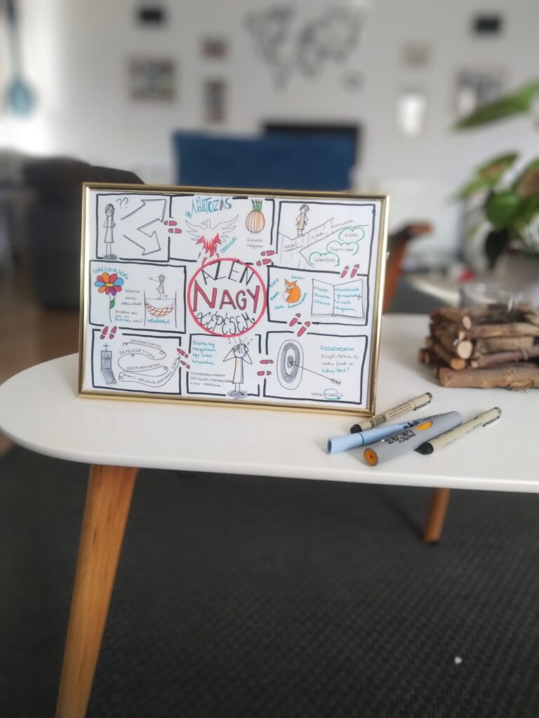 A közös coaching alkalom után készítem el a vizuális jegyzetet, ami a coaching ülés során elhangzott szavakból, feismerésekből, mérföldkövekből áll. Tulajdonképpe a folyamatodat vizualizálom, ami még nagyobb hangsúlyt és erőt ad a fejlődésednek.